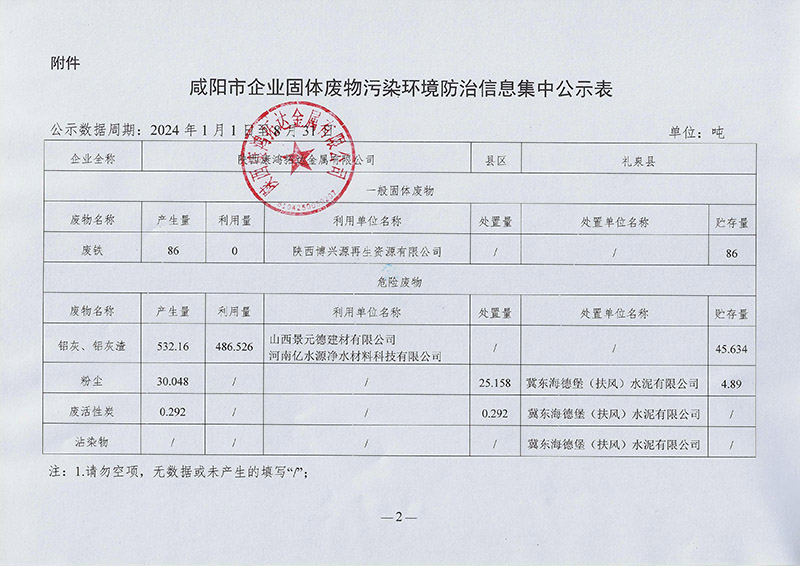 咸阳市企业固定废物污染环境防治信息集中公示表